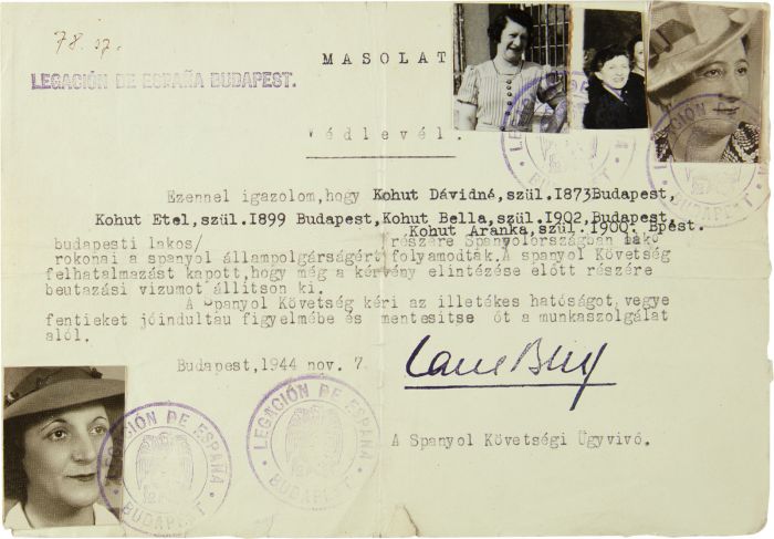 letter of protection issued to four female members of the kohut family prepared by angel sanz briz with his stamped signature and endorsement legacion de espana en budapest