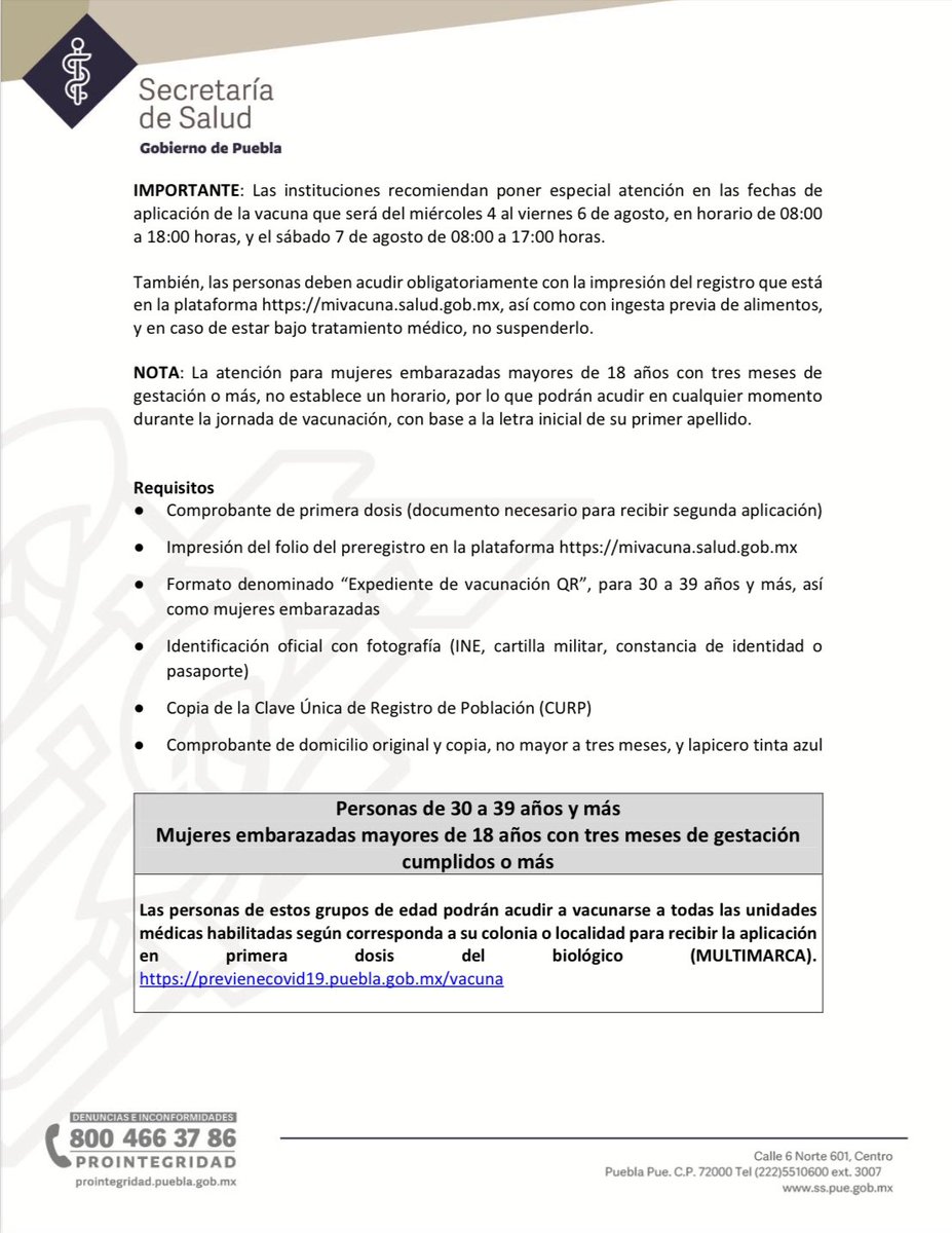 secretaria de salud on twitter atencion poblanas y poblanos de puebla capital como parte de la brigada correcaminos informamos la logistica de vacunacion para personas de 30 1 a dosis