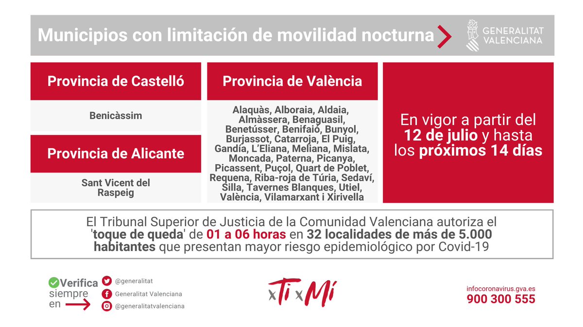 generalitat on twitter municipios con limitacion de movilidad nocturna el tsjcv autoriza el toque de queda de 1 a 6 horas en 32 localidades de mas de 5 000 habitantes que