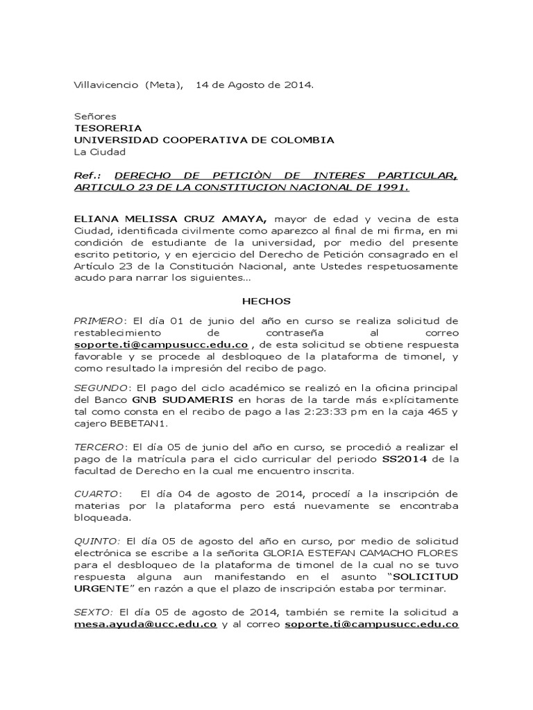 derecho de peticion de melissa cruz vs ucc responsabilidad informacion del gobierno