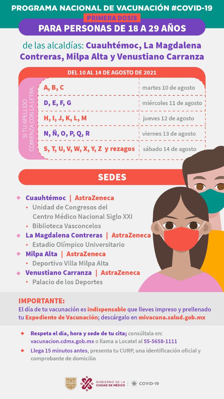 gobierno cdmx on twitter anunciamos que del 10 al 14 de agosto continuara el programa nacional de vacunacion covid19 para los jovenes de 18 a 29 anos de las alcaldias cuauhtemoc
